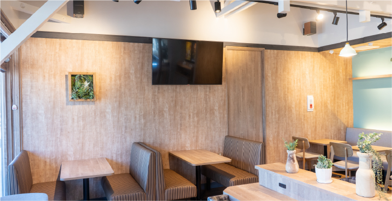 | リフォームポイント | 飲食店の機能を持った就労支援施設となりますので、大型の厨房機器導入のための改修、フロアの内装全体をリフォームいたしました。 内装では清潔感を出した白のクロスに元々の木造作りの良さをミックスしたオシャレな雰囲気づくりができました。電気や空調も整備し、快適で居心地の良い空間となりました。 |